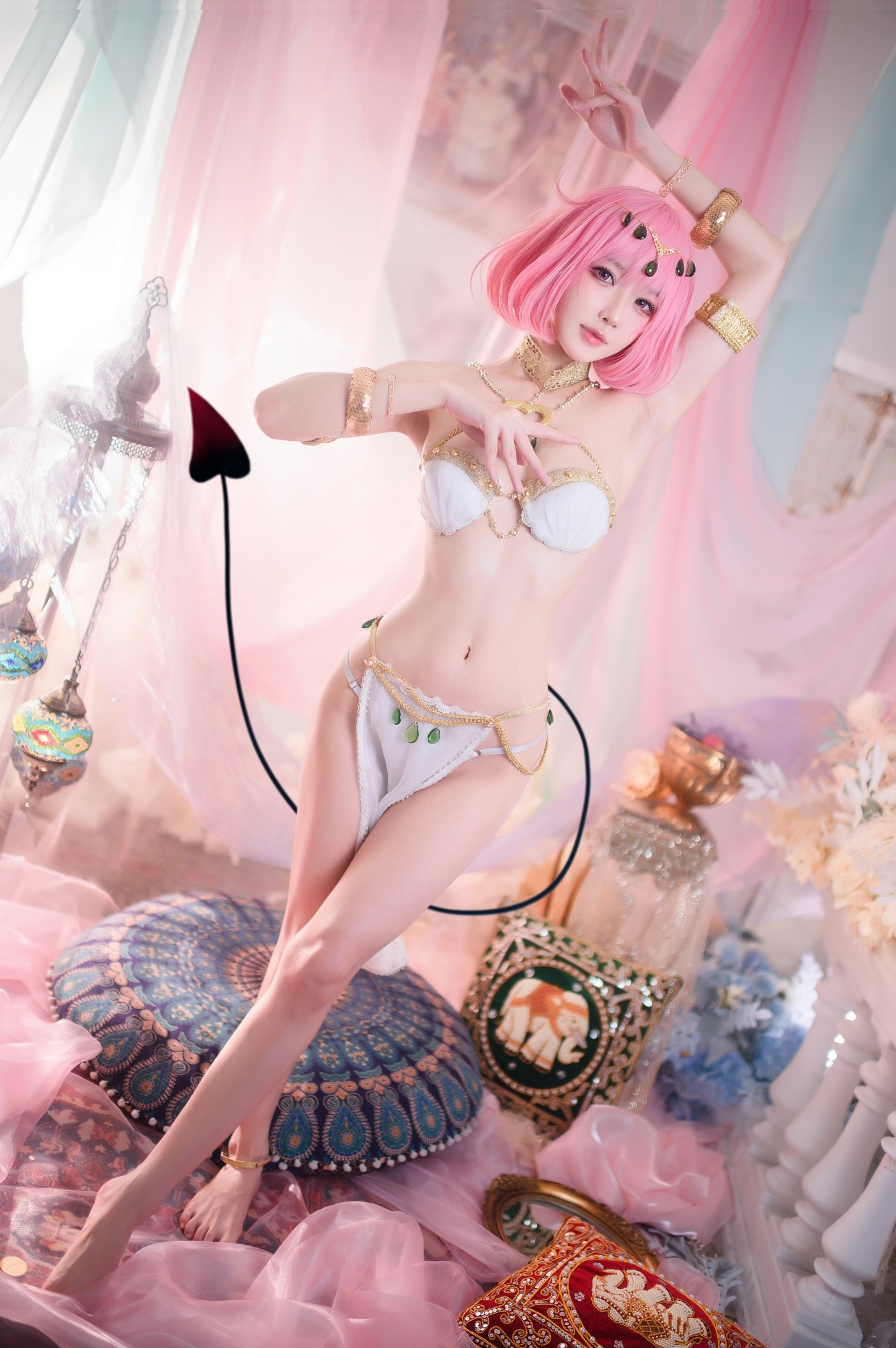 在这组写真中,阿包也是兔娘身穿精致的舞娘服装,服装设计融合了丰富的色彩、流苏和珠宝装饰,细节精美,既展现了她的曼妙身姿,又增添了一丝异域风情。她的每一个姿态和表情,都散发出一种优雅与动感,仿佛是在舞台上翩翩起舞的舞娘。