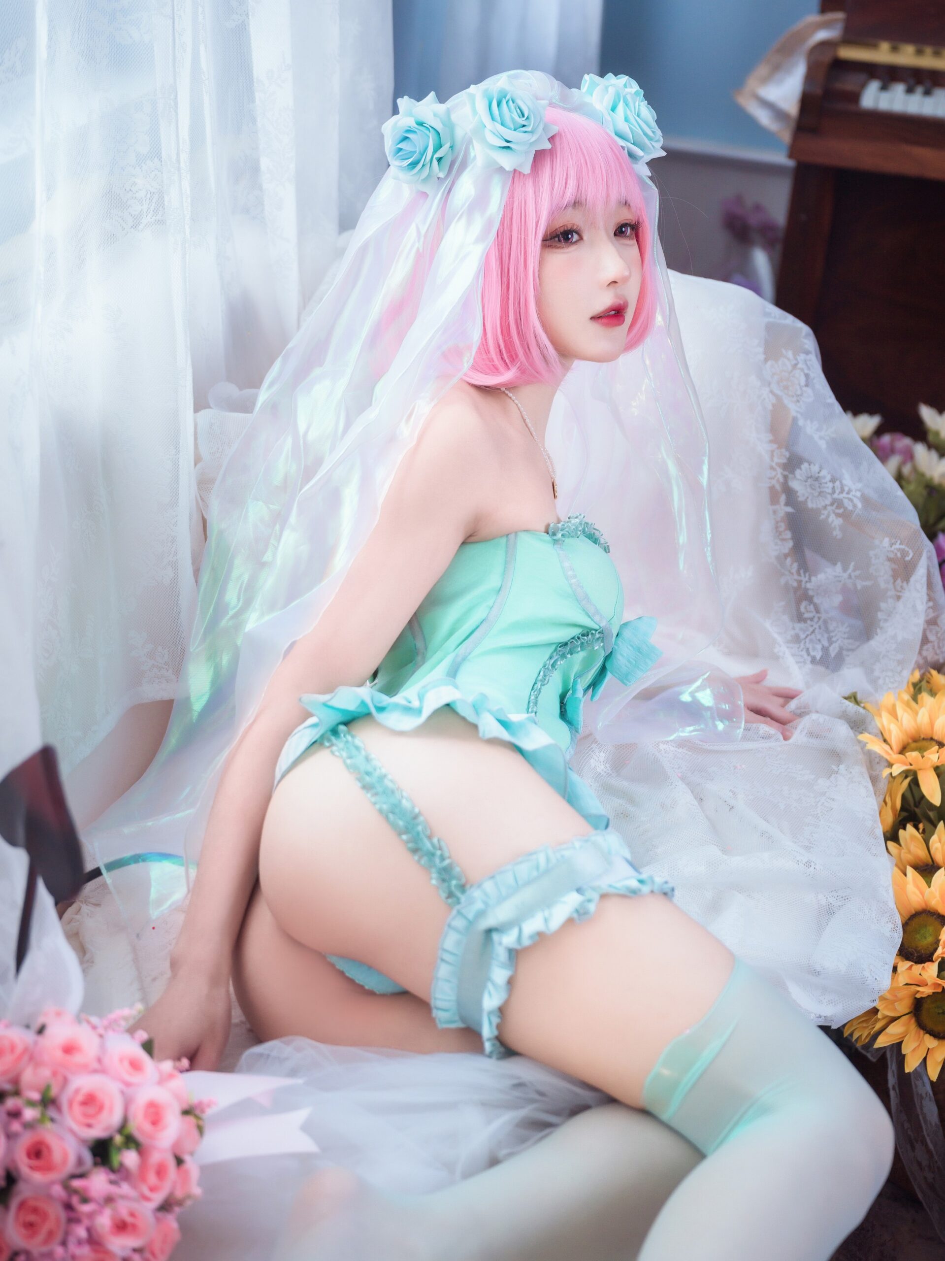 在这组写真中,阿包也是兔娘身穿精致的婚纱内衣,设计融合了传统婚纱的优雅与内衣的性感。白色蕾丝、薄纱和精美的装饰,使得整套服装既展现了她的优雅曲线,又增添了一丝梦幻与诱惑。她的每一个姿态和表情,都散发出一种纯洁与魅力的气质,仿佛是一个刚刚走出童话世界的新娘。